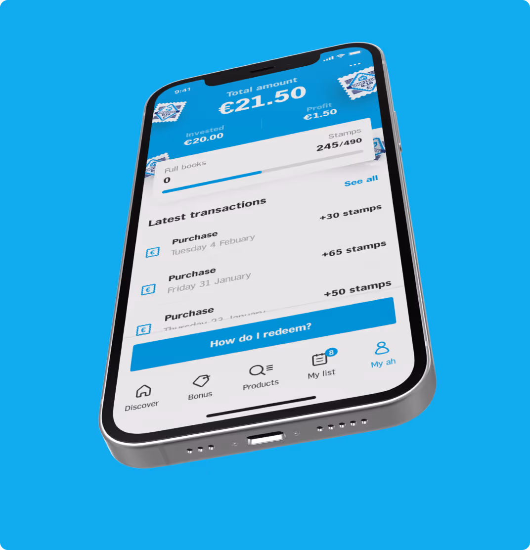 Koopzegels is a physical savings system used in Albert Heijn stores. The challenge was to bring this behaviour into the mobile app without disrupting the shopping flow.I owned the product design for the mobile experience, translating the savings model into a digital interaction and integrating it into the shopping journey.